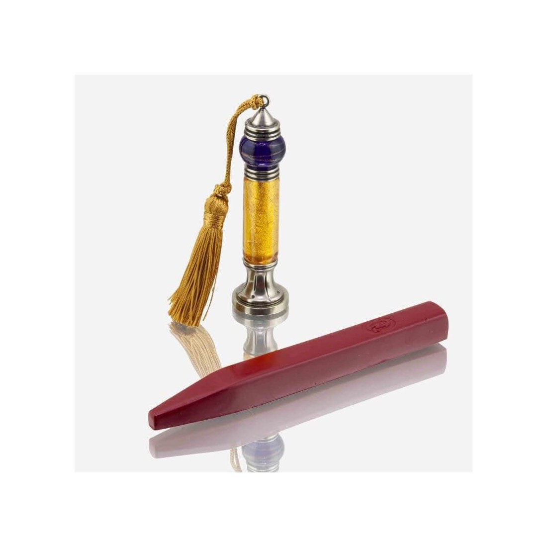 Bortoletti Glasstempel og voksforseglingssæt - Casanova Er et luksuriøst venetiansk forseglingstilbehør håndlavet fra Murano Glass og beriget med delikat 24ct guldblad. Designet til brug med udskiftelige 22 mm Bortoletti Voks forsegling frimærker, det bringer lysende farve, raffineret håndværk og elegant karakter til bryllupsstationer, korrespondance og gavepræsentation.