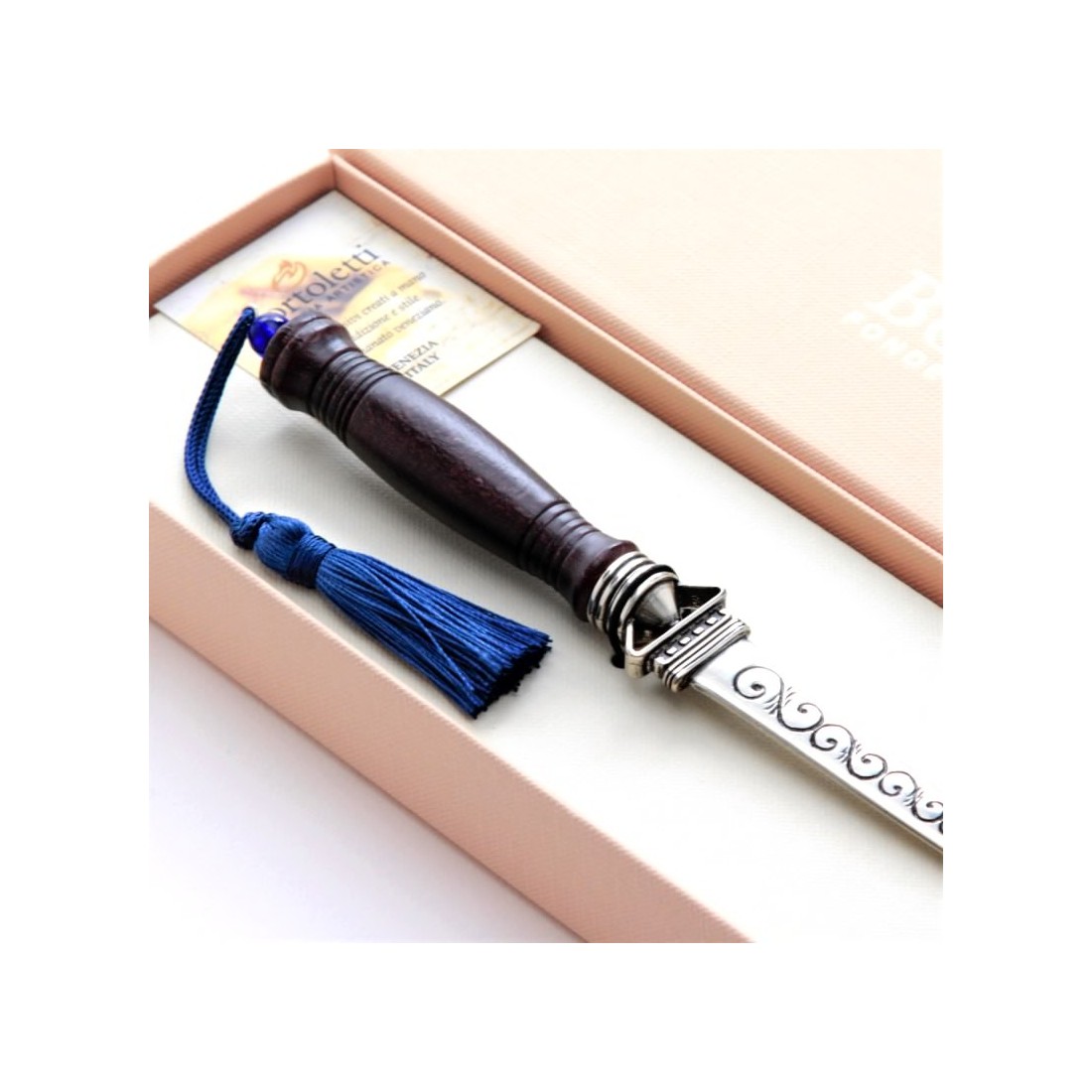Træbrevåbner en idé til en elegant og enkelt stilfuld gave fra håndværksmestres tradition og erfaring. Et typisk håndværksprodukt, tæt knyttet til det sted, det kommer fra, og dets traditioner, der er et resultat af Bortolettis og hans mester-juvelerers kontinuerlige forskning inden for design.