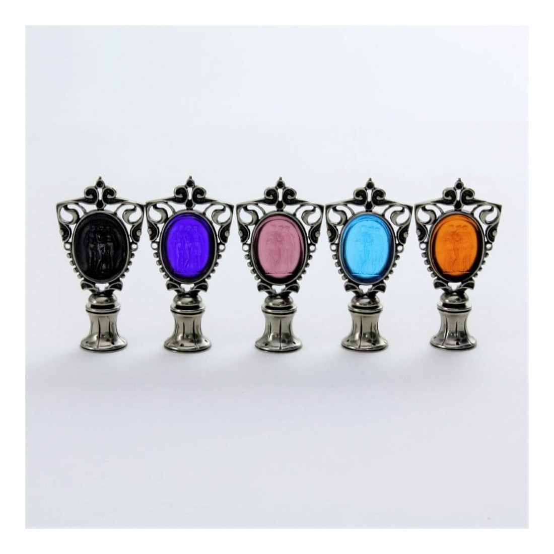 De tre Graces Wax Seal er tilgængelig i et valg af Amber, Ametyst, Aquamarine, Sortog og Blå. Dette valg giver dig mulighed for at vælge en finish, der supplerer dit papirvarer, skrivebordstilbehør, bryllupsstyling eller gaveindstillinger, mens du holder cameo detaljer som fokuspunktet for designet.