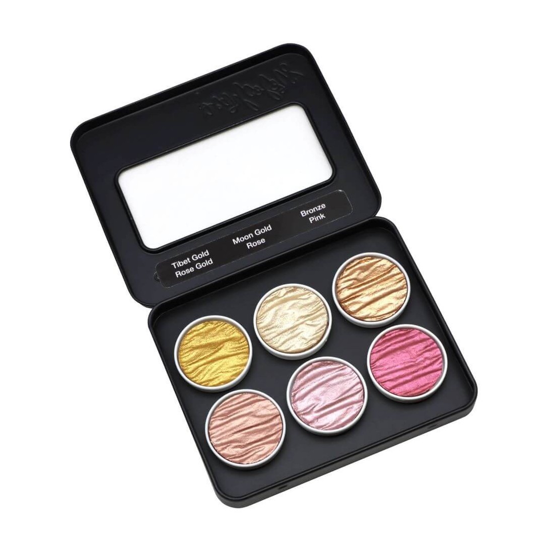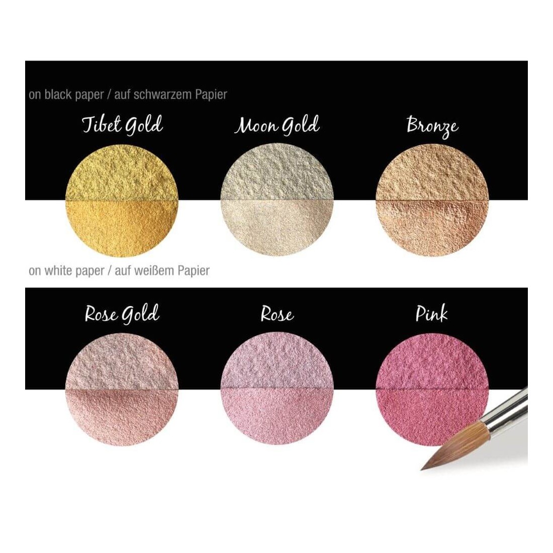 Lavet af glimmer, et naturligt mineral, der tilbyder et bredt udvalg af metalliske nuancer, fra guld og sølv til iriserende, skinnende perlefarver. Aktiver med lidt vand på paletten og gælder for nib med en børste. Overholder alle absorberende overflader, såsom papir, træ, gips osv.