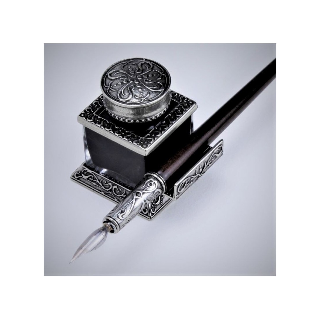 Inkwellen indeholder en særlig bronzeunderstøttelse på forsiden, så kalligrafi-penen hviler pænt mellem anvendelser. Denne praktiske funktion hjælper med at holde pennen tæt ved hånden, mens det også bidrager til det skulpturelle design af sættet, hvilket gør det specielt tiltalende som et dekorativt objekt til skrivebordet.