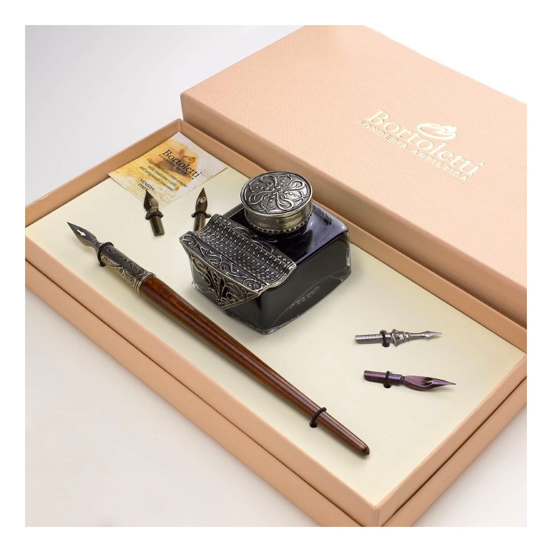 Bortoletti Tiziano Wooden Calkligrafi sæt med Bronze Inkwell er et raffineret venetiansk skriveæt med en perfekt afbalanceret trækalligrafi pen med bronze detaljer, en graveret bronze og glas inkwell, fire vintage nibs og Hamburg kalligrafisk blæk. Håndlavet i Bortoletti Workshop, det er et elegant valg til håndskrift, skrivebordsvisning og arv-inspireret gave giver.