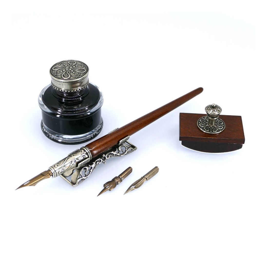 Dieses Schreibungssatz umfasst einen hölzernen Kalligraphie-Tauchstift, einen Glaskennzeichen mit schwarzer Tinte, einem Bronzemenhalter, einem Signaturtrockner und drei antiken Nibs. Zusammen erstellen diese Elemente ein komplettes Schreibtisch-Ensemble für Handschrift, Display und nachdenkliche Empfindungen.
