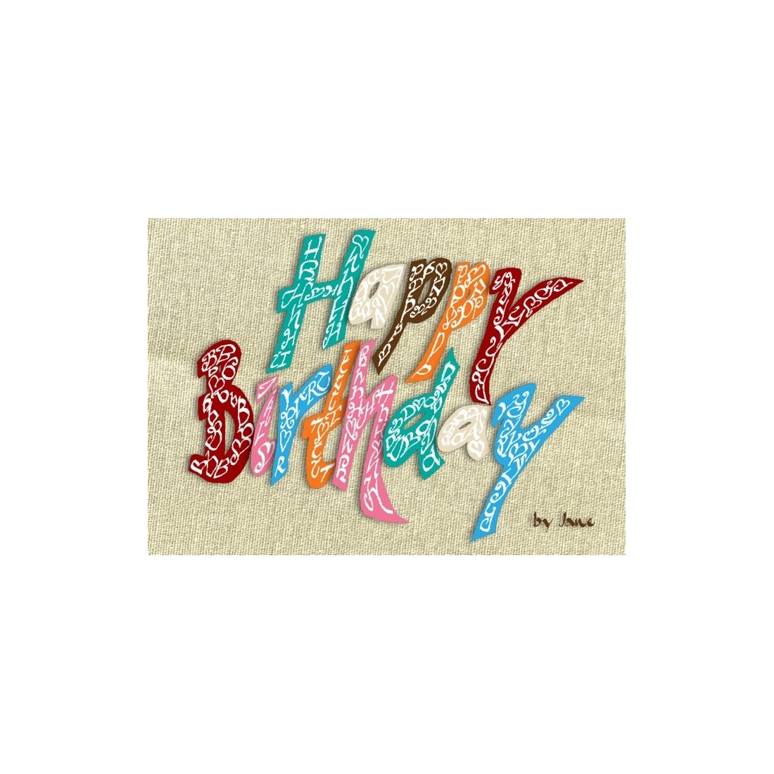 Die Happy Birthday Classic Card ist eine unverwechselbare Geburtstagsgrußkarte von Calligraphy Arts, entworfen von Jane mit mehrfarbigen kalligraphischen Zeichen, die auf einem hessischen Hintergrund platziert sind. Diese klassische Farbvariante bringt dekorative Beschriftung und strukturierte visuelle Style zusammen, um eine Geburtstagskarte zu erstellen, die künstlerisch, fröhlich und voller Charakter fühlt.