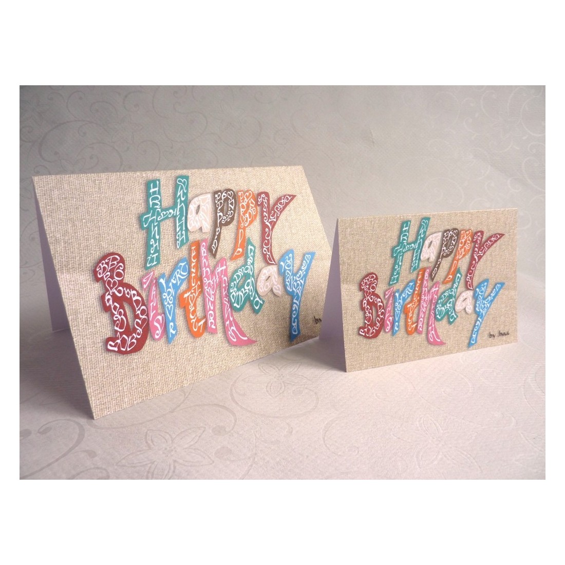 Der hessische Hintergrund verleiht dieser Geburtstagskarte ein klassischer und strukturierteres Erscheinungsbild, der den mehrfarbigen kalligraphischen Charakteren hilft, sich wunderbar auszurichten. Diese Kombination aus rustikal inspirierter Hintergrund und pulsierender Schriftzug erzeugt ein Design, das sowohl unterscheidend als auch feierlich fühlt.