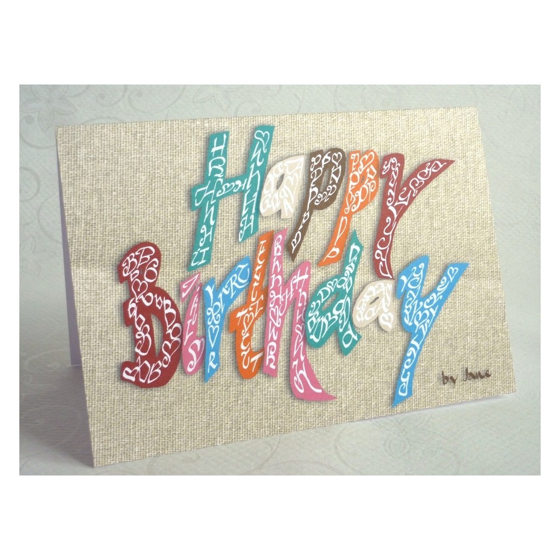 The happy birthday classic card from Calligraphy Arts Ist eine farbenfrohe Geburtstagskarte, die von Jane entworfen wurde, der die Worte "Happy Birthday" in mehrfarbigen kalligraphischen Charakteren mit einem klassischen hessischen Hintergrund einsetzt.