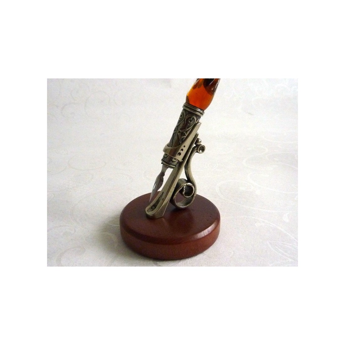Die Einfachheit der Dekorationen mit der Ausdruckskraft der Materialien kombiniert. Dieser Stifthalter ist aus Holz gefertigt und fein gearbeitete Neusilber. Es gibt zwei Versionen. Eine für ein Glas oder Holz Stift. Die andere ist für einen Federfeder konzipiert. Beide Stile sind elegant Stücke, die Persönlichkeit zu verleihen, um Ihren Schreibtisch.