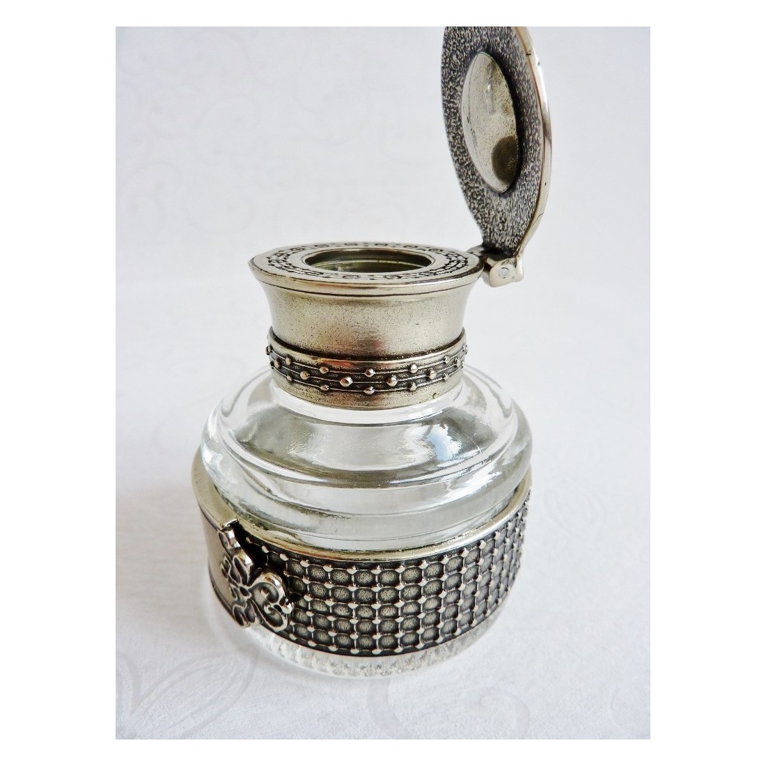 Dieses elegante Tintenfass aus Glas und handgefertigtem Neusilber hat eine verzierte Klappkappe und bietet Ihnen die Möglichkeit, einen Namen auf der Vorderseite zu gravieren, was es zu einem idealen Geschenk macht. Hergestellt in Italien von Bortoletti Fonderia Artistica.