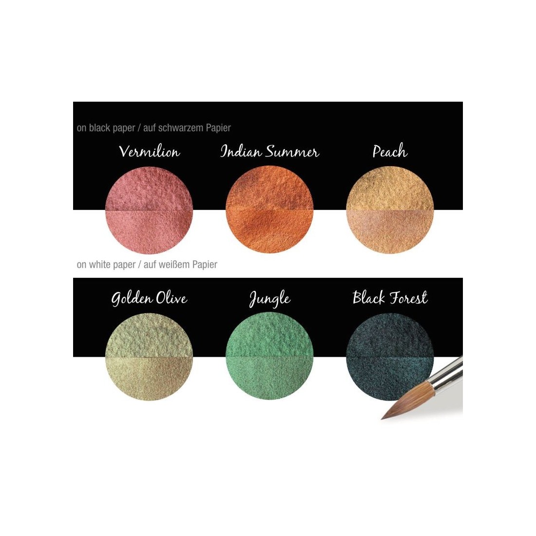Gebildet vom Glimmer, ein natürliches Mineral, das eine breite Vielzahl der metallischen Schatten anbietet, von Gold und von Silber zu irisierenden, glänzenden Perlenfarben. Mit etwas Wasser auf die Palette auftragen und mit einem Pinsel auf die Spitze auftragen. Haftet auf allen saugfähigen Oberflächen wie Papier, Holz, Gips usw.