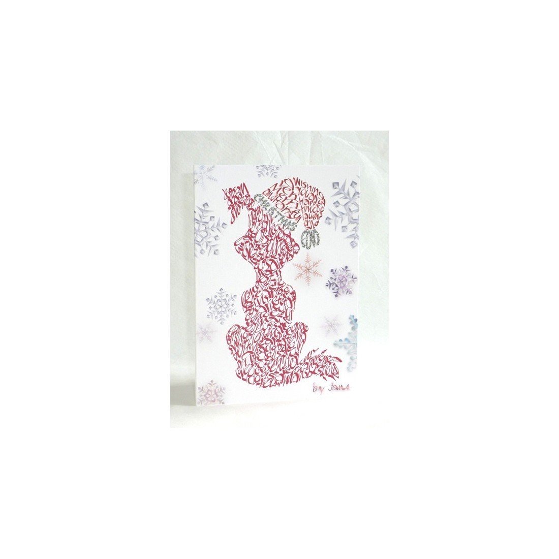 Unsere einzigartige Hundekarte entworfen und handgemacht auf einem weißen Hintergrund mit Schneeflocken fallen alle around.The Hund trägt einen schönen roten glitzernden Weihnachtsweihnachtsmütze .