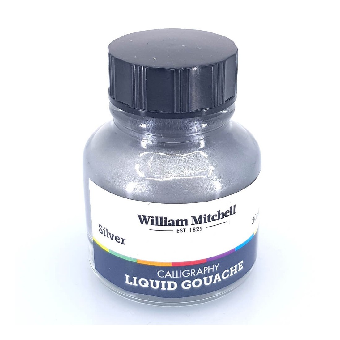 William Mitchell Liquid Gouache - Silber ist ein hochpigmentierter metallischer flüssiger Gouache, der in einer praktischen 30-ml-Flasche geliefert wird. Es bietet eine reibungslose, undurchsichtige Abdeckung und lichtechteste Qualitäten und bietet ein helles silbernes Finish ideal für Kalligraphie, Beschriftung und dekorative Kunstwerke.