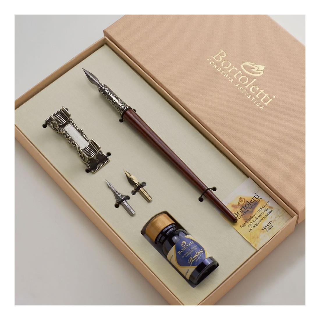 Bortoletti BEMBO Hölzerner Kalligraphie-Stift mit Bronze-Stiftrest eingestellt ist ein einfaches und elegantes Schreibsatz mit einem handgefertigten Holzstift, einem handscharlären Bronze-Nib-Halter, drei Vintage-Nibs, eine Flasche von Hamburg Kalligraphie-Tinte und eine passende Stiftruhe. In der Bortoletti Labor in Venedig ist eine raffinierte Wahl für feine Punktkalligraphie, stilvoller Schreibtischnutzung und nachdenkliches Geschenk.