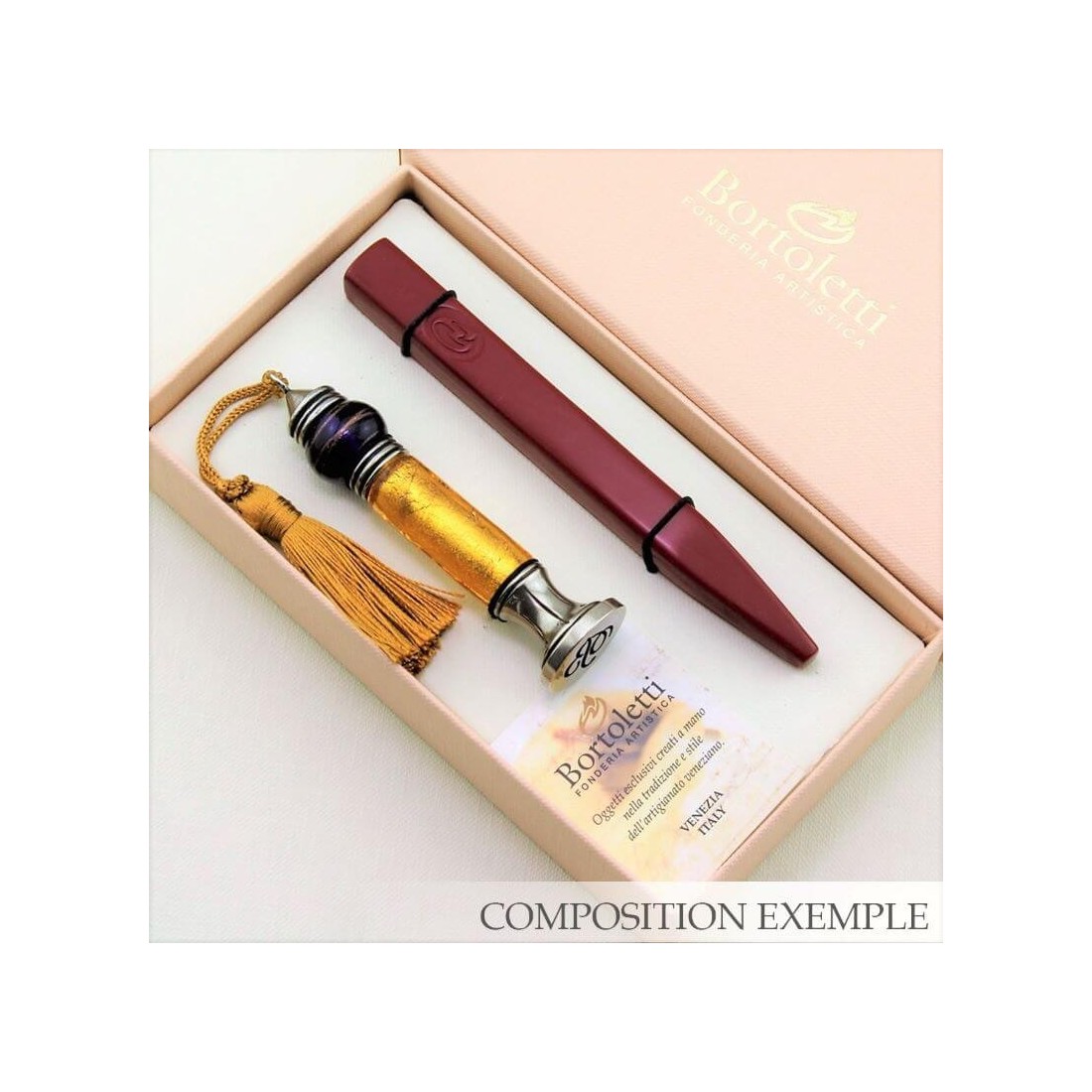 Bortoletti glass stamp and wax seal set – Casanova is a luxurious Venetian sealing accessory handmade from Murano glass and enriched with delicate 24ct gold leaf. Designed for use with interchangeable 22 mm Bortoletti wax seal stamps, it brings luminous colour, refined craftsmanship, and elegant character to wedding stationery, correspondence, and gift presentation.
