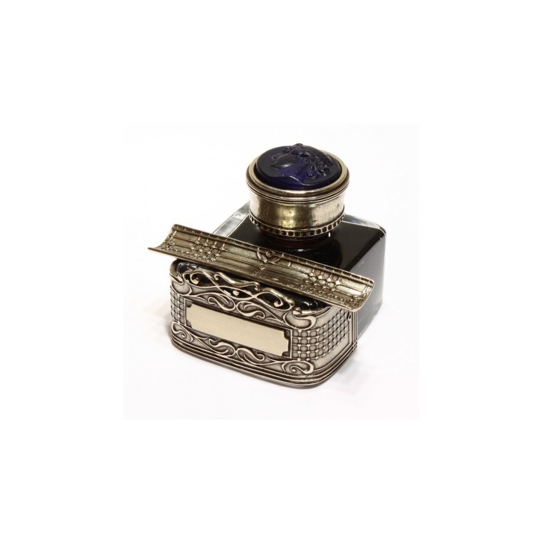 Wonderful glass inkwell decorated with hand chiseled nickel silver which serves as a useful pen rest. The lid is decorated with a fine cameo glass paste. This bottle is filled with black ink.