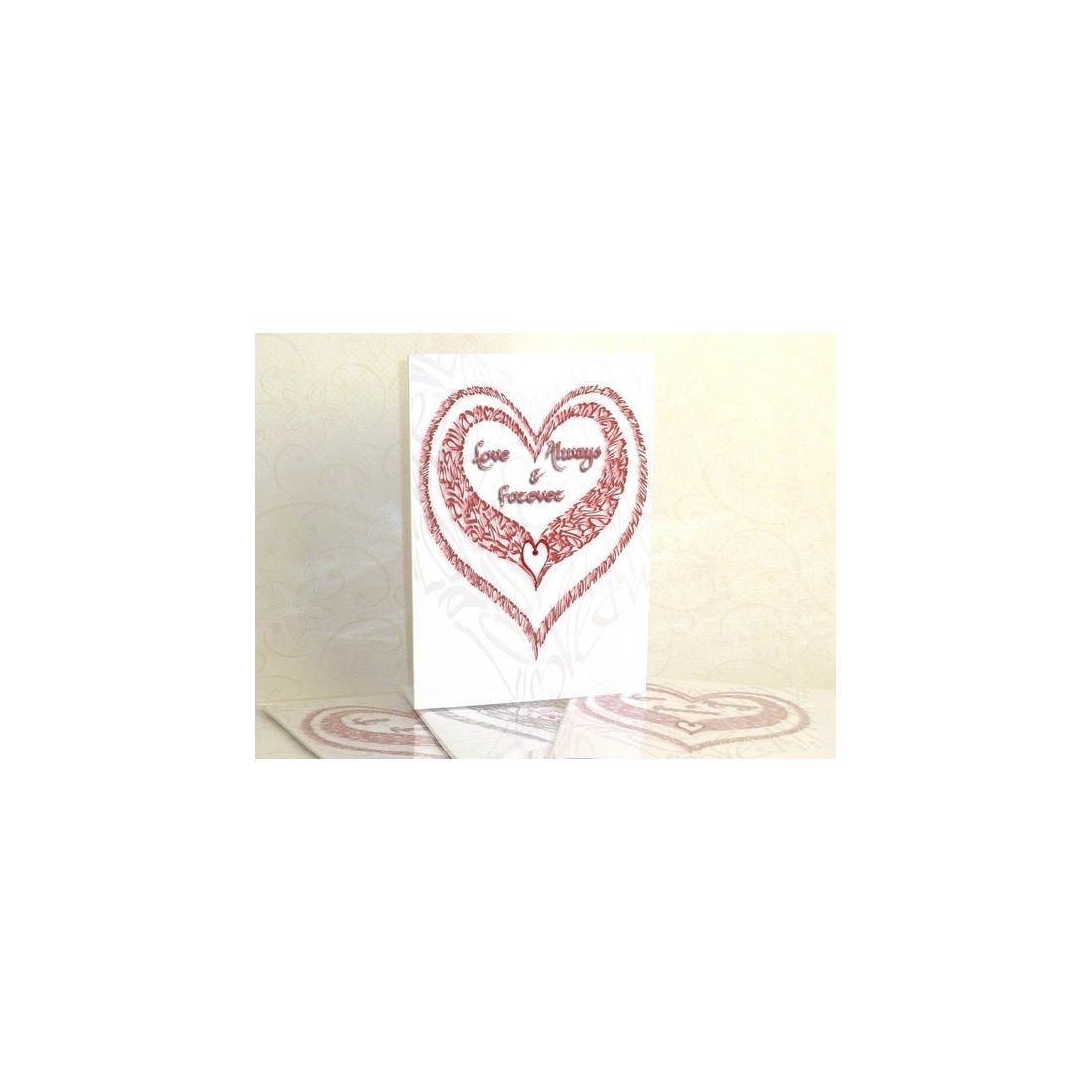 Let your true love know you care with this wonderful card. Jane's calligraphic style once again shows how you can present your feelings in a uniquely special way. The main design is presented on a background of another calligraphic heart. Red glitter and a sparkling diamante are at the heart of the card with other clear diamantes elsewhere.