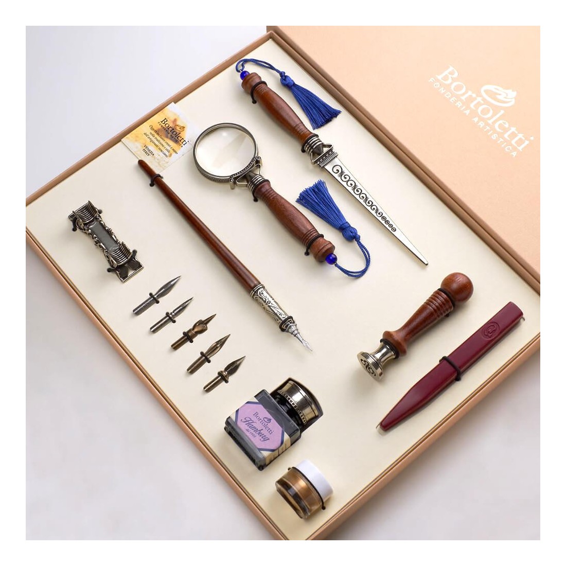 Este impresionante Bortoletti El juego incluye un Pen de caligrafía de madera de haya Midiendo aproximadamente 21 cm, seis nibs vintage, Tinta de caligrafía negra de 30 ml.un abridor de letras de madera de hayaun Lupa en bronce chapado en plata de níquel.un Sello de cera de madera con placa intercambiable., cera de sellado, Crema de oro para resaltar impresiones de cera., una elegante caja de regalo de presentación, y un certificado de garantía. Reúne una experiencia completa de escritura y sellado en una colección coordinada para el escritorio.