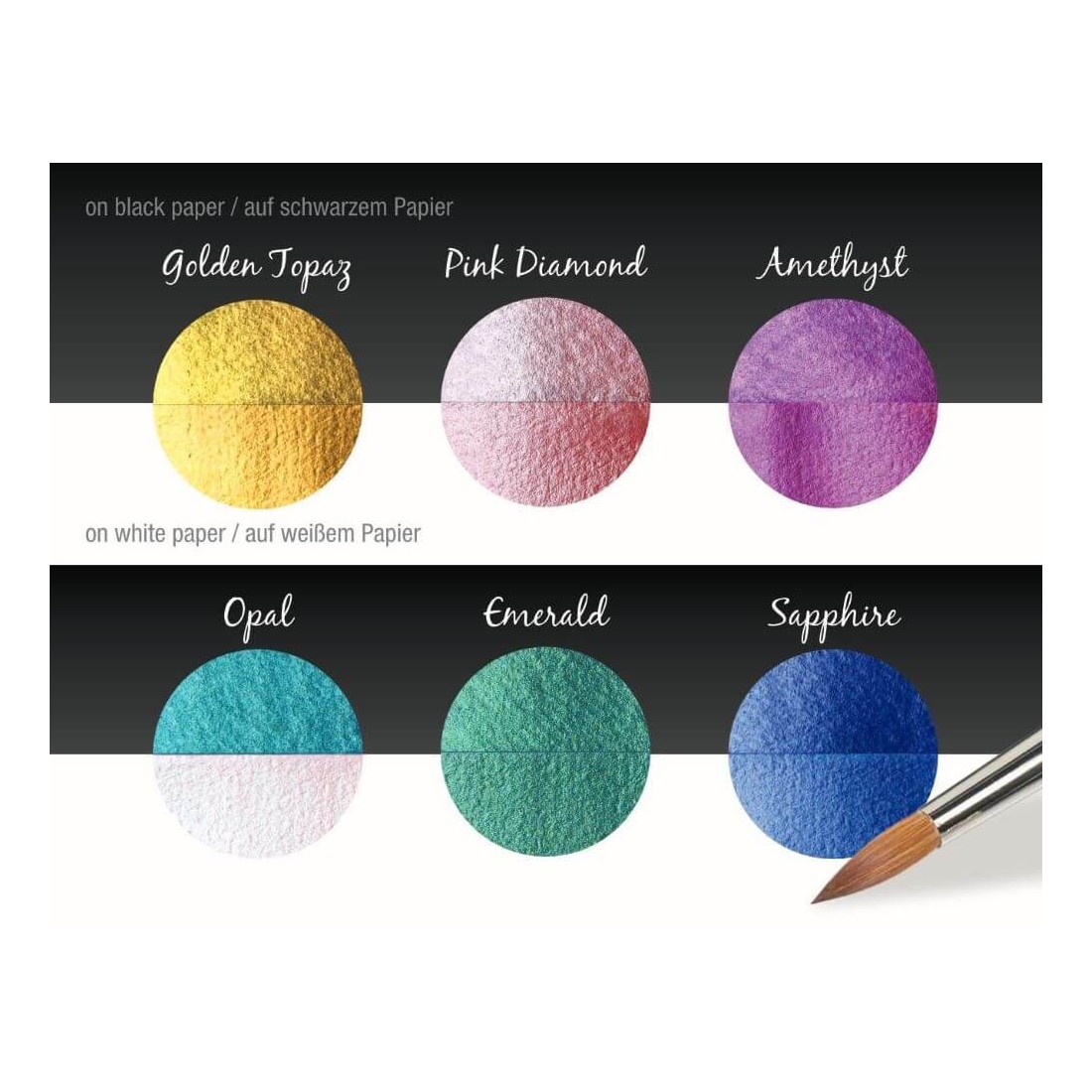 Esta caja de metal contiene cinco tonos de color opacos "Golden Topaz", "Pink Diamond", "Amethyst", "Emerald" y "Sapphire", así como el color translúcido "Opal": este se ve brillante en papel negro y brillante en blanco papel.