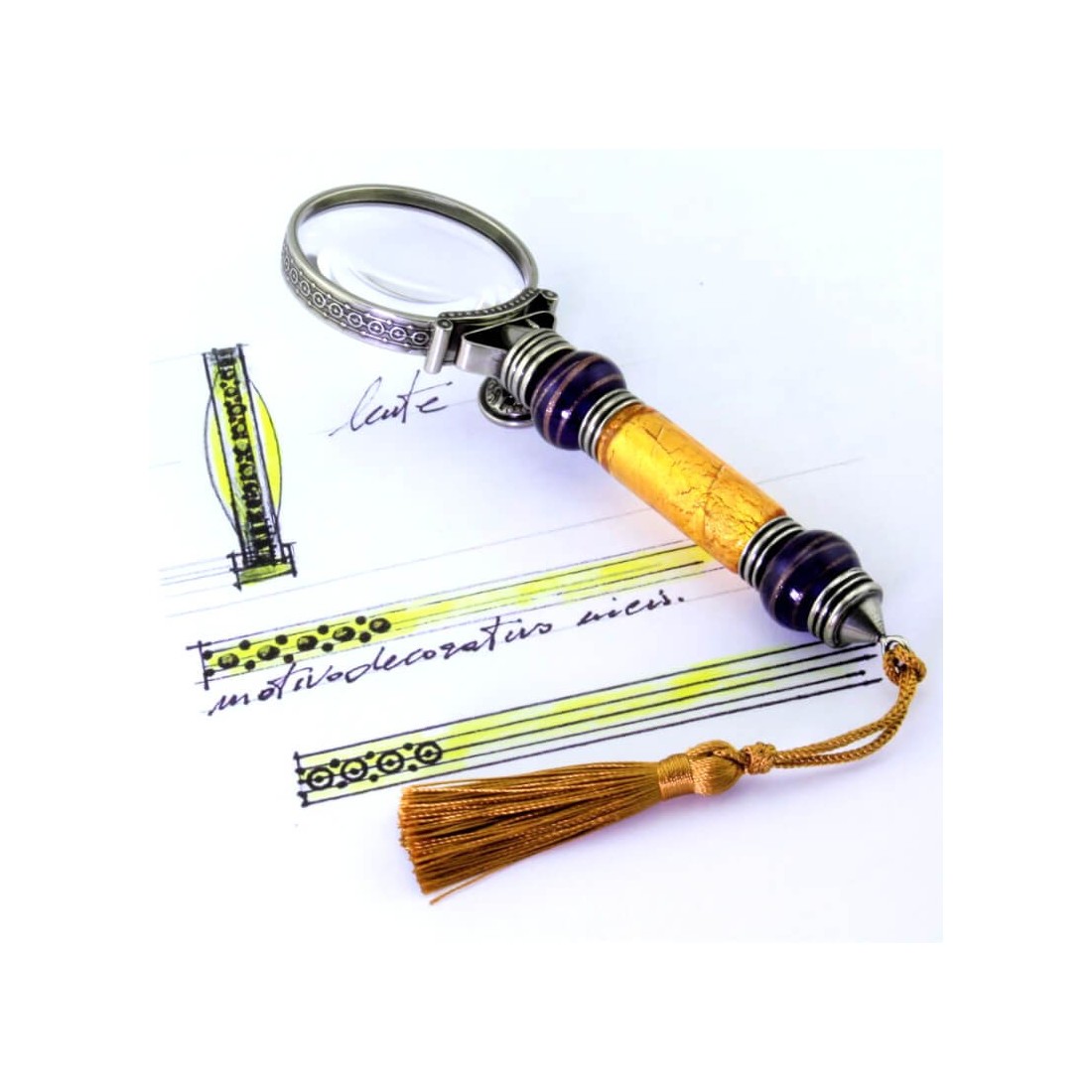 Lupa con precioso pan de oro de 24 quilates fundido en cristal de Murano para el regalo más elegante. Una exclusiva lupa de bronce y cristal de Murano realizada por los maestros vidrieros de Bortoletti en su taller. Una adición valiosa y de buen gusto a su escritorio con un diseño que nunca pasa de moda, diseñado para agregar un toque de clase a su escritorio.