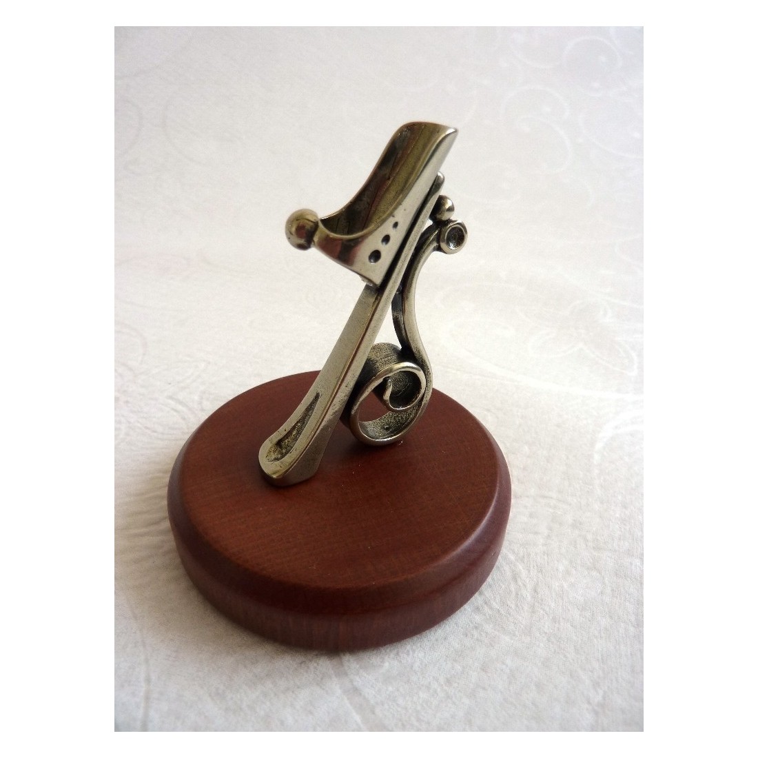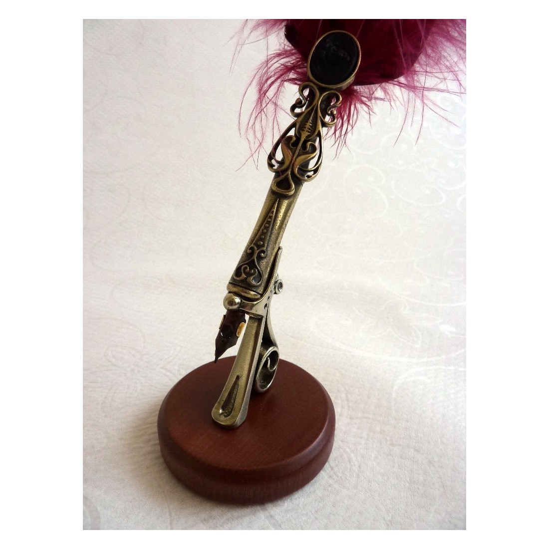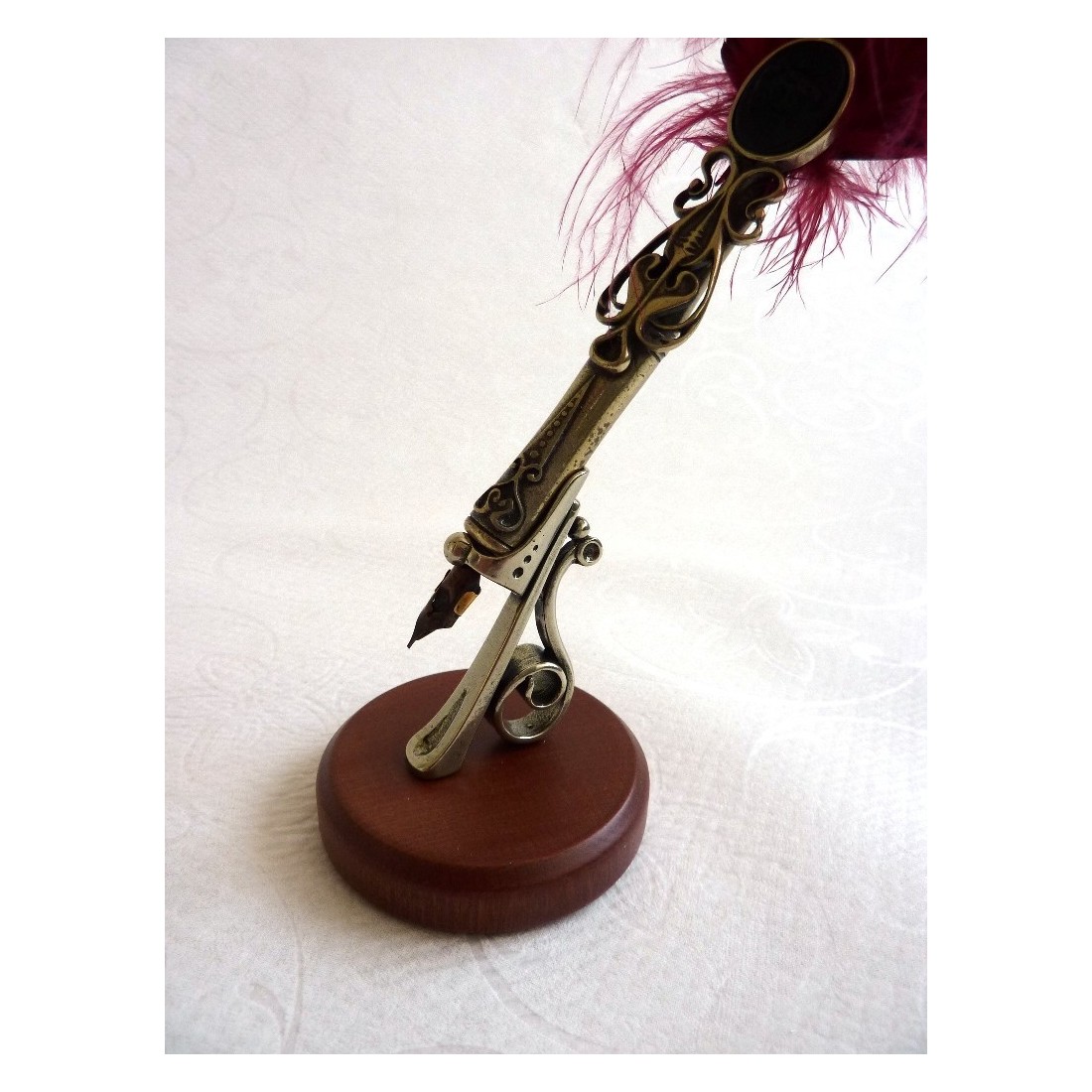 La simplicidad de las decoraciones se combina con la fuerza expresiva de los materiales. Este sostenedor de la pluma está hecha de madera y finamente trabajado plata níquel. Hay dos versiones. Uno para un cristal o un bolígrafo de madera. El otro está diseñado para una pluma pluma. Ambos estilos son elegantes piezas, que confieren personalidad a su escritorio.
