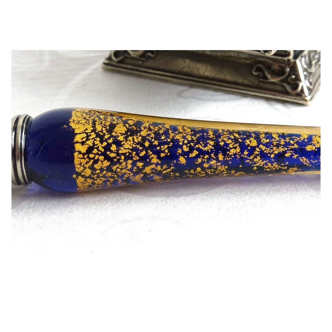 Un maravillosamente hecho a mano, acabado a mano, pluma de la inmersión caligrafía conjunto con cristal de Murano y pan de oro. Se compone de un cristal y plata de níquel plateado, plumilla de bronce, cuatro plumas y un tintero adornado. Disponible en una gama de colores maravillosos.