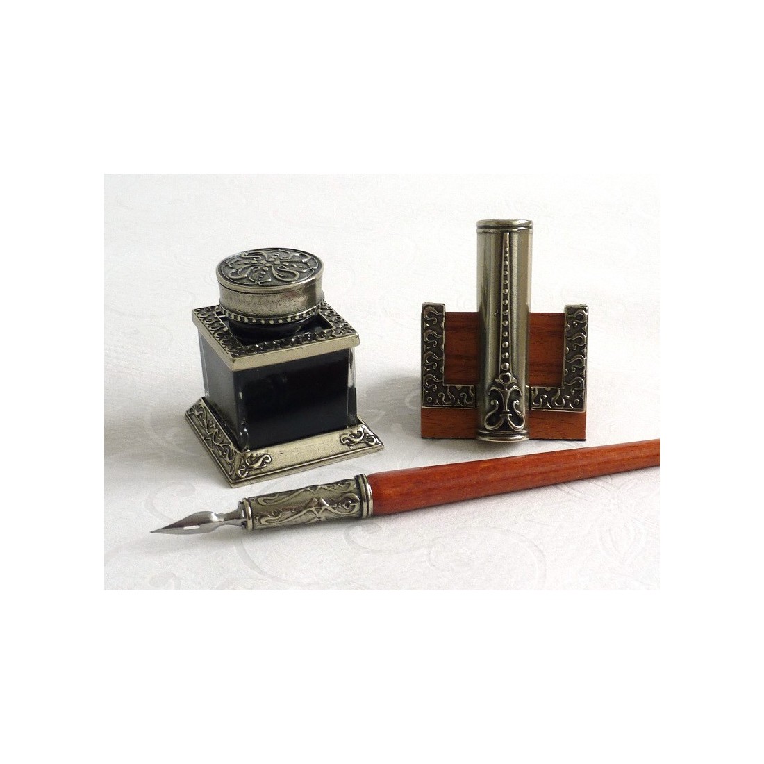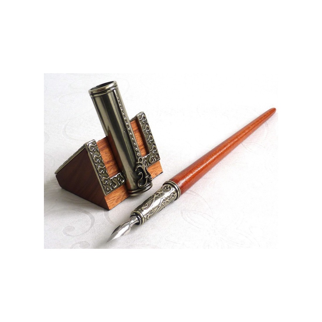 Pluma de caligrafía de madera, tintero y portaplumas
