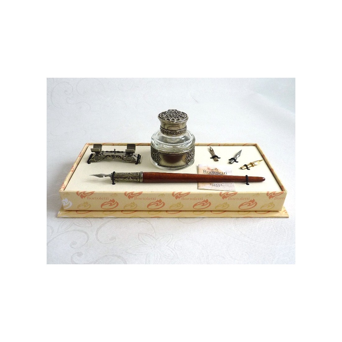 Juego de bolígrafos de madera para caligrafía con tintero de vidrio y reposapiés ornamentado. El juego se compone de un bolígrafo de madera con porta plumillas de bronce bañado en alpaca, tintero y cuatro plumillas antiguas. Ideal como regalo. Fabricado en Italia por Bortoletti Fonderia Artistica.