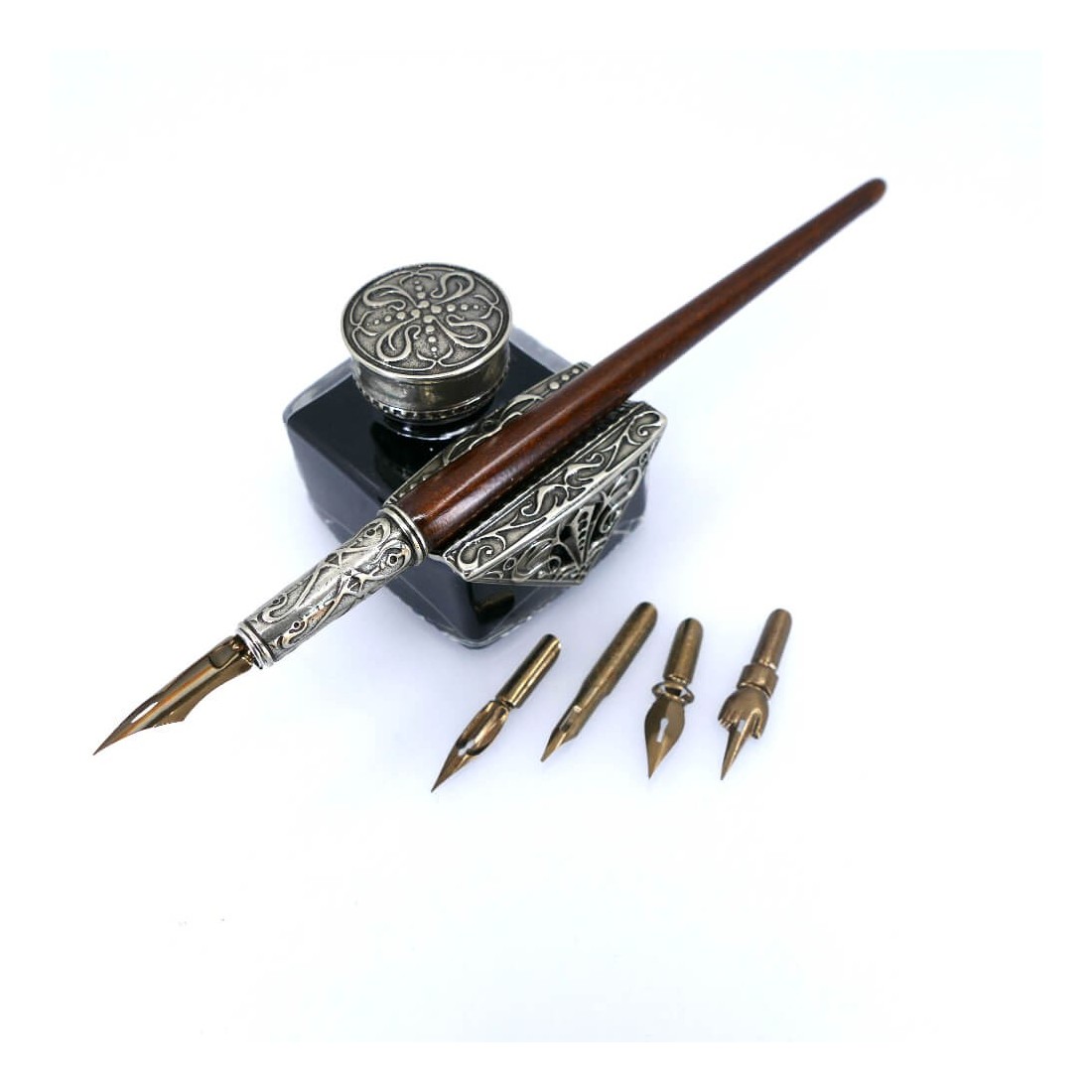 Un excelente juego de rotuladores de caligrafía, que consta de un rotulador de caligrafía de madera, un tintero de vidrio de alpaca con un portalápices de bronce integrado. Completo con cinco puntas antiguas.