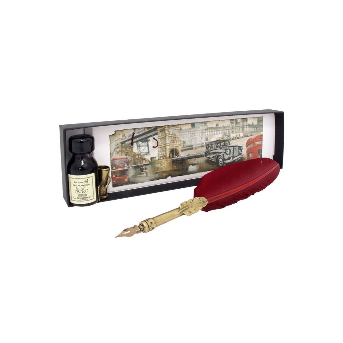 Esta pluma está terminada con un distintivo diseño de pluma en el eje de color latón e incluye una botella de tinta negra con un portalápices de color de latón a juego. El set viene empaquetado en una caja de regalo inspirada en Londres para crear un set de regalo moderno perfecto para los amantes de la caligrafía y el arte. Fabricado en Italia.