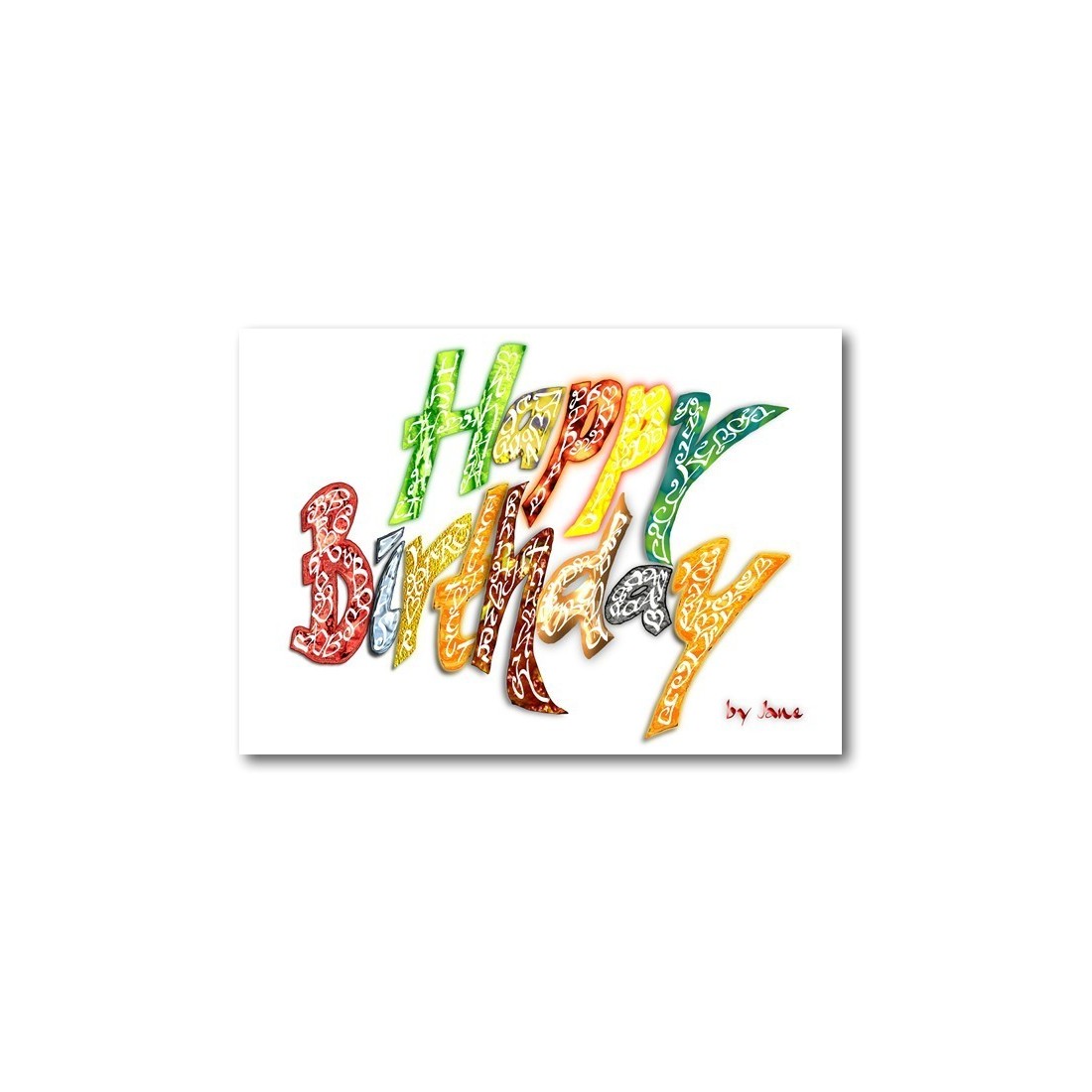 La tarjeta de luz general de feliz cumpleaños de Calligraphy Arts Es una tarjeta de cumpleaños brillante y alegre diseñada por Jane, con letras caligráficas multicolores sobre un fondo blanco limpio para un acabado fresco y elegante.