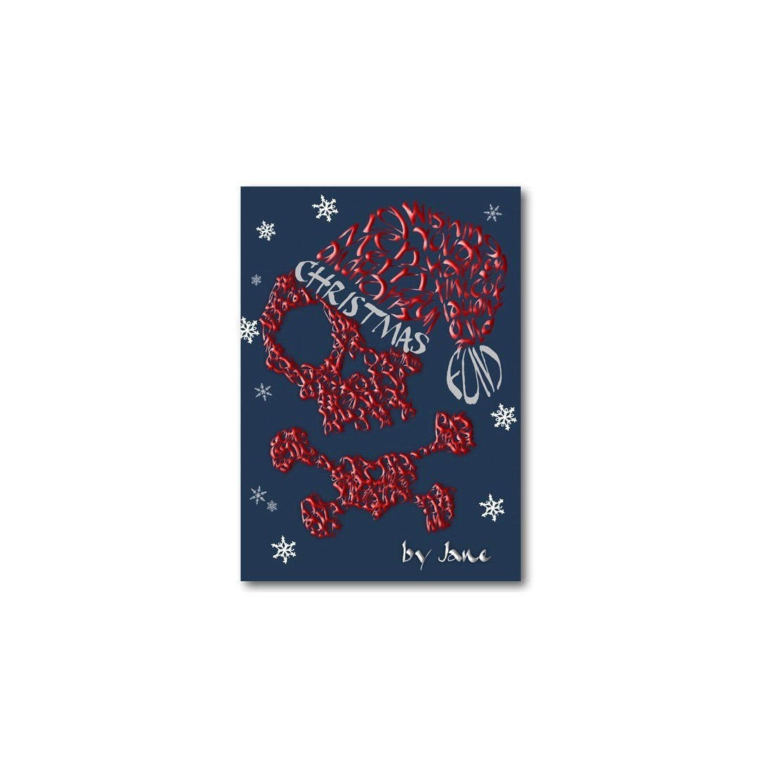 Feliz Navidad, ahoy me hearties !! Nuestra exclusiva tarjeta hecha a mano con calavera pirata y tibias cruzadas está lista para las festividades de temporada. Con un efecto 3D rojo navideño y copos de nieve sobre un fondo azul oscuro, se completa con un festivo gorro de Papá Noel.
