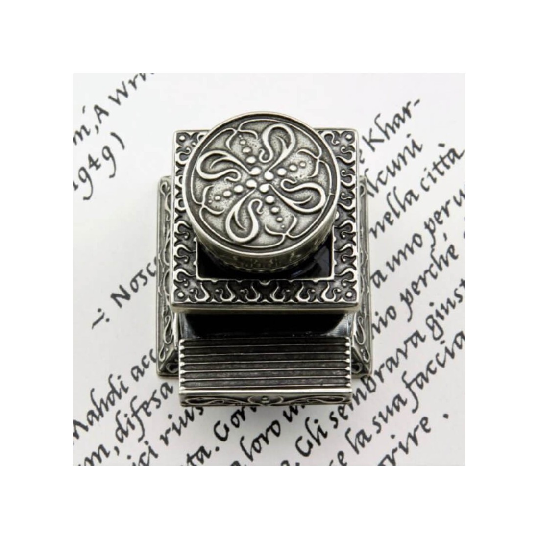 Cada pieza está hecha a mano individualmente en Italia utilizando materias primas cuidadosamente seleccionadas. La base decorativa de bronce y los detalles se trabajan finamente para crear una apariencia refinada pero con características. No hay dos piezas idénticas, lo que hace que cada tintero sea único.