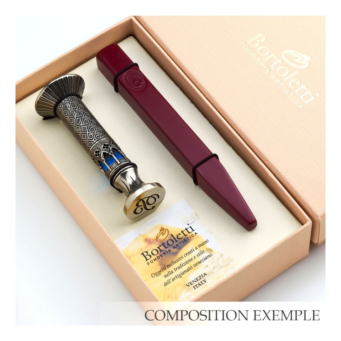 Bortoletti Mango de sello de sello de cera - Ducale Es un accesorio de sellado veneciano premium hecho a mano en bronce sólido con una carcasa decorativa de vidrio de Murano. Diseñado para su uso con 22 mm intercambiables. Bortoletti Sellos de cera Sellos, trae herencia, elegancia y artesanía fina italiana a papelería de boda, correspondencia y presentación de regalos.