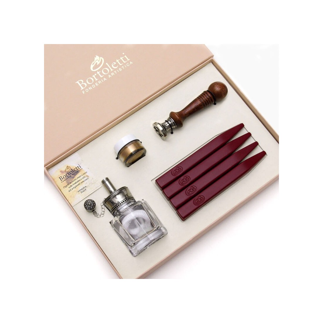 Este lujo Bortoletti El juego incluye un Mango de sello de cera de maderaun sello de sello inicial inicial doble intercambiable de 22 mm, cuatro palos de cera de sellado, un quemador de alcohol para una crema de cera limpia, cera de oro para resaltar decorativo, una caja de regalo de presentación y un certificado de garantía. Es una opción todo en uno, todo en uno para cualquier persona que busca crear sellos de cera de aspecto profesional con un acabado tradicional.