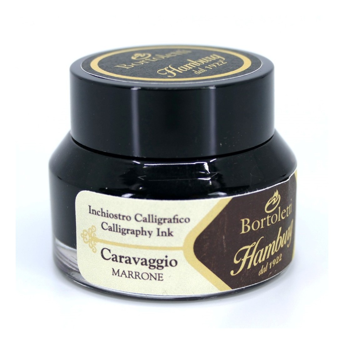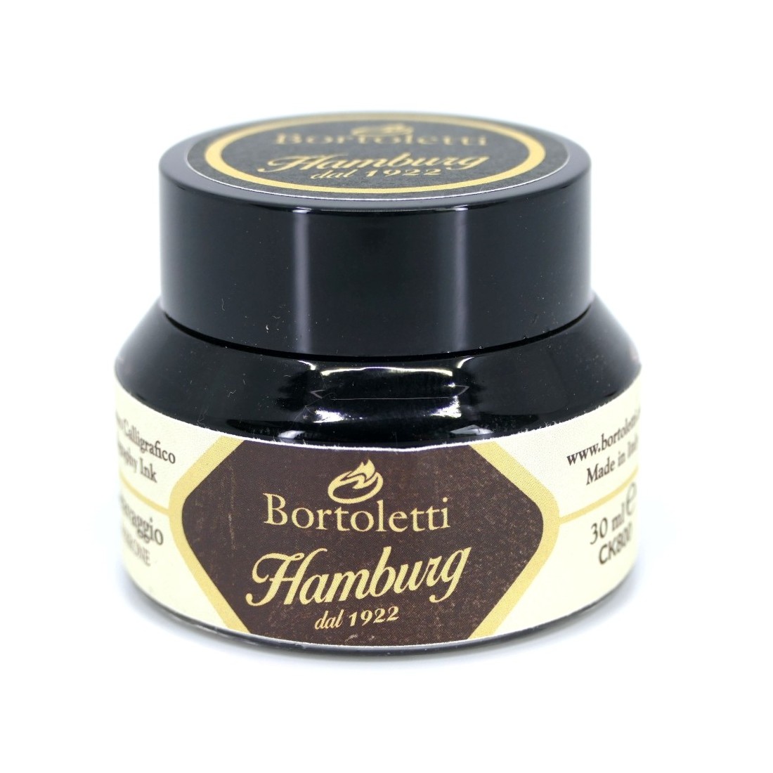 Esta tinta forma parte de la Bortoletti Rango de tintas de caligrafía fabricadas en Italia por Hamburg, combinando la artesanía tradicional con experiencia profesional de producción de tinta.