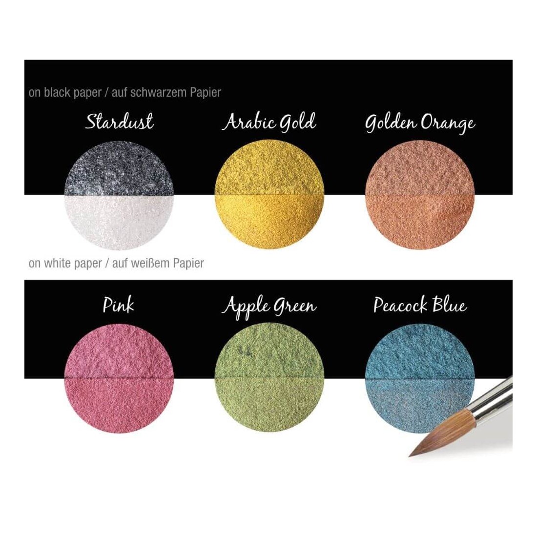 Hecho de mica, un mineral natural que ofrece una amplia variedad de tonos metálicos, de oro y plata a los colores de perlas brillantes y iridiscentes. Active con un poco de agua en la paleta y se aplique a la punta con un cepillo. Se adhiere a todas las superficies absorbentes, como papel, madera, yeso, etc.