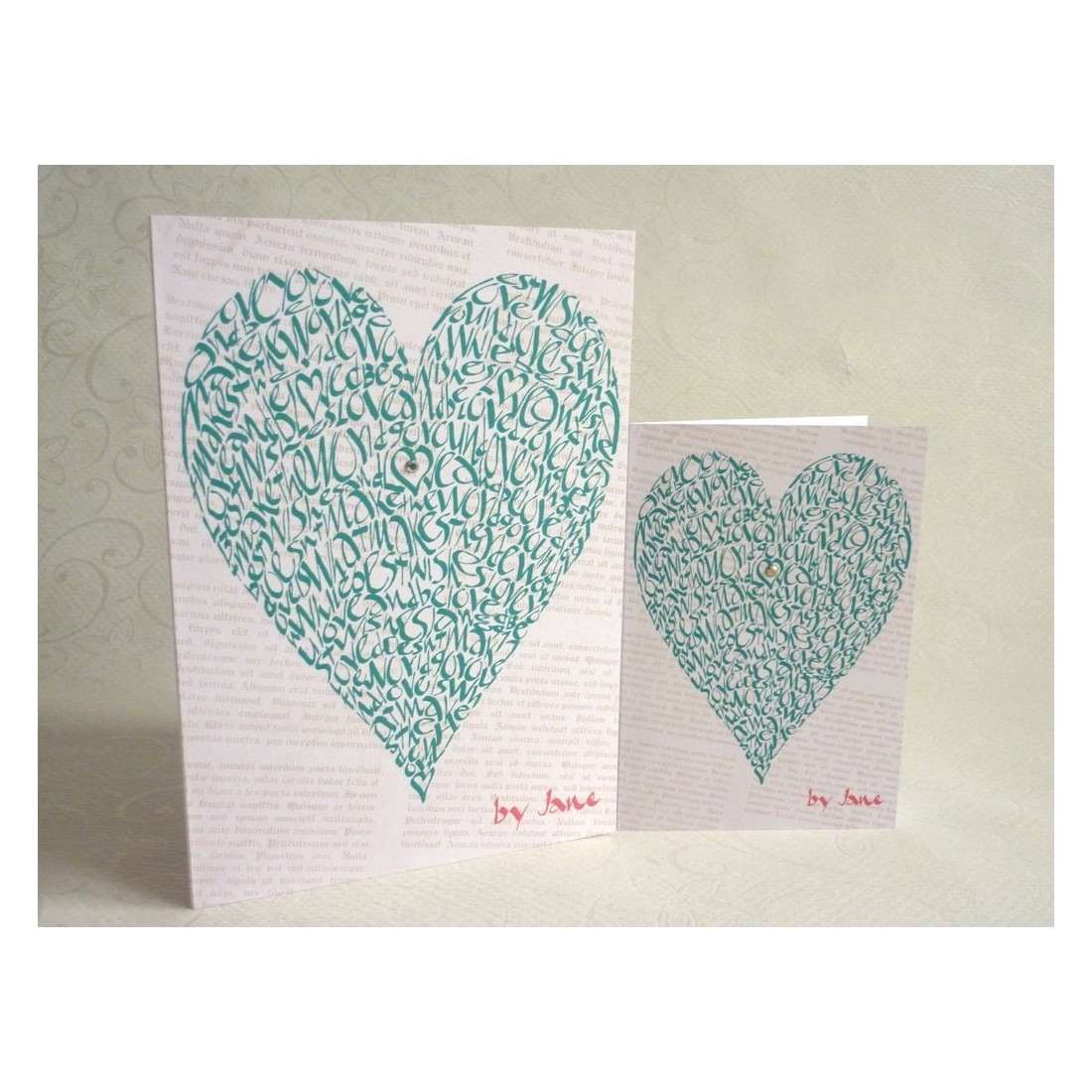 La combinación de diseño caligráfico, forma de corazón, estilo verde y diamantes cuidadosamente colocados le da a esta tarjeta un encanto acabado hecho a mano. Se destaca de los saludos ordinarios y ofrece una opción más artística y personal para los clientes que buscan algo memorable.