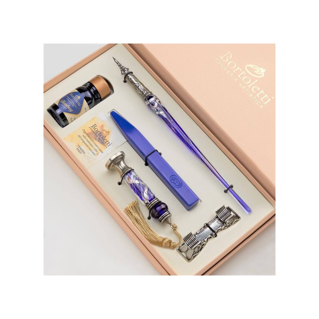 Tämä erottuva Bortoletti Set sisältää a Murano lasi kalligrafia kynä, a Nikkeli-hopeapinnoitetut pronssihorisontaaliset kynäpidikkeet, a Murano Lasi vahatiiviste, Vaihdettava tiivistyslevy, kalligrafia, esityspakkaukset ja takuustodistus. Se tarjoaa tyylikästä tavan yhdistää käsinkirjoitetun kirjeenvaihdon perinteisen vahatiivisteen kanssa, kaikki yhdessä koordinoidussa venetsialaisessa sarjassa.