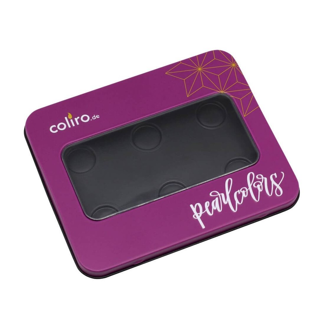 Kompakti ja tyylikäs violetti Coliro paletti laatikko 6 Pearlcolor. Siinä on läpinäkyvä kansi, jossa näkyvät värit, ja nimen kiinnittimet.