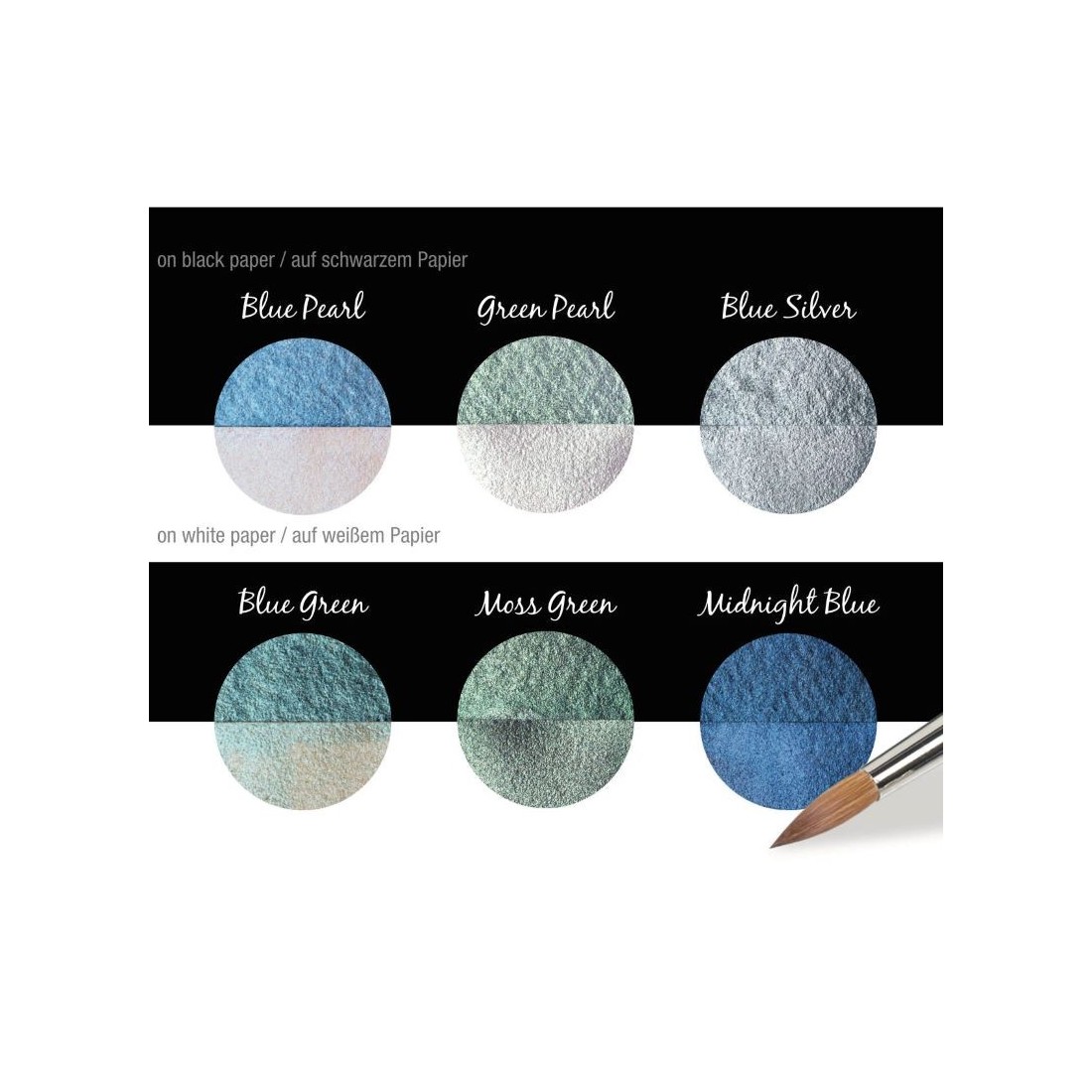 Valmistettu kiille, luonnon mineraali, joka tarjoaa laajan valikoiman metallinhohtosävyt, kulta ja hopea värikkäiden, loistava helmi värejä. Aktivoi hieman vettä paletti ja sovelletaan NIB harjalla. Noudatetaan kaikkia vaimennuspinta, kuten paperi, puu, kipsi, jne.