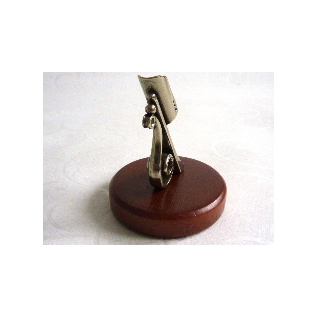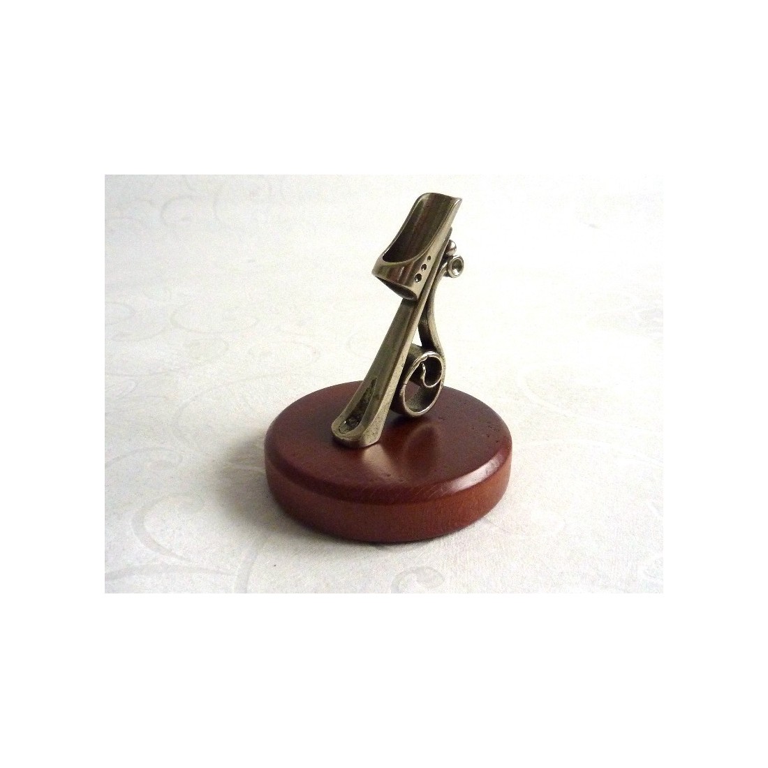Kalligrafiakynän pidike. Koristeiden yksinkertaisuus yhdistetään materiaalien ilmaisuvoimaan. Tämä kynänpidike on valmistettu puusta ja hienoksi työstetystä nikkeli-hopeasta. Valmistanut Italiassa Bortoletti Fonderia Artistica.