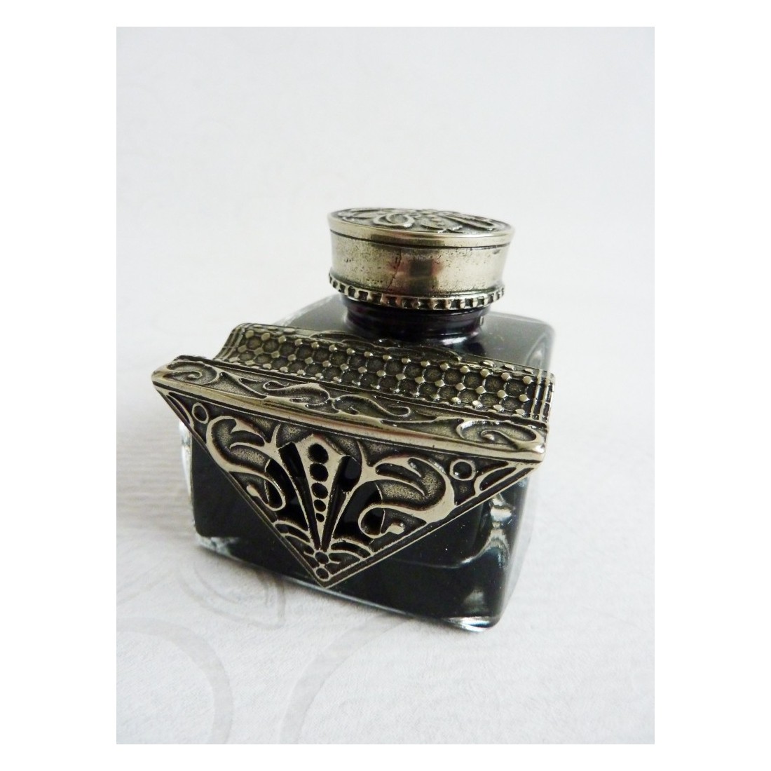 Alpaca-mustesäiliö kynätuki. Kaunis muotoilu pronssista ja nikkeli-hopeasta - erittäin tyylikäs ja perinteinen. Kolmion muotoinen etuosa välittää tyylikkyyttä ja luonnetta. Valmistanut Italiassa Bortoletti Fonderia Artistica.