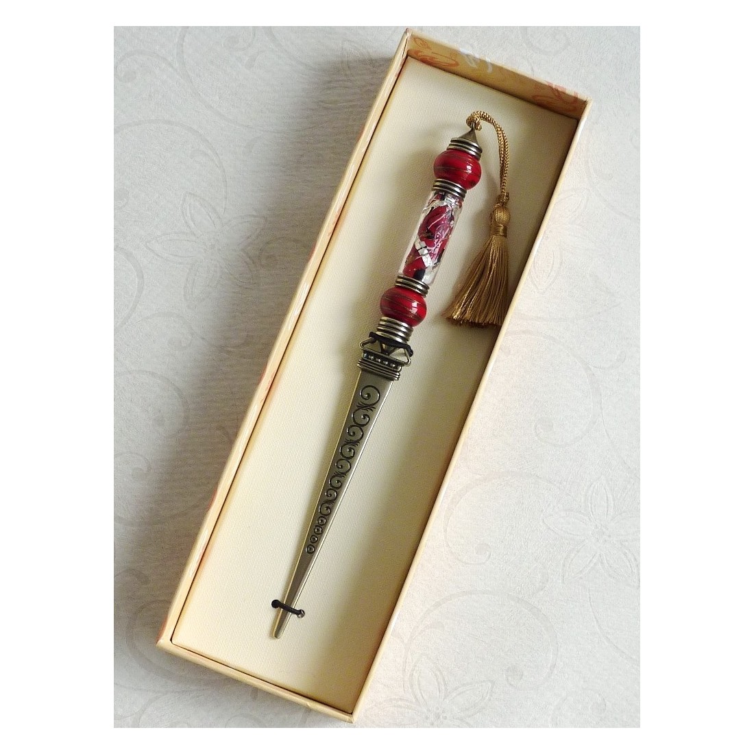 Lasi ja nikkeli-hopea kirjeenavaaja. Hieno venetsialainen tyyli, joka on määritelty uudelleen. Tämä tekee tyylikkään lahjan ja näyttää upealta kirjoituspöydälläsi. Käsintehty Murano-lasilla. Saatavana eri väreinä.