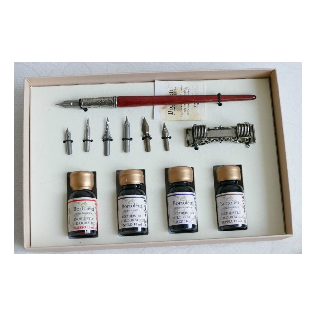 Suuri arvo ja hienostuneisuutta. Set koostuu puinen kynä, pronssi kynä kannattaja, neljä pulloa muste ja kuusi antiikki terät.