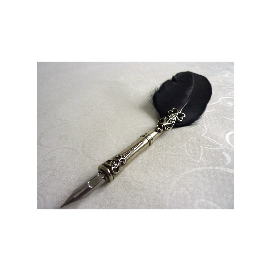Höyhenpeite, mustepatruuna ja kynäteline. Tämä sarja sisältää hanhen sulka-kalligrafiakynän, jossa on pronssikärkipidike päällystetty nikkeli-hopealla, mustesäiliö ja kynänpidike, pergamentti, jolla on kirjoittamisen historia, ja kynänpidike. Nikkeli-hopeakoriste rikastuttaa höyhenkynää, mustekasettia ja kynänpidikettä. Tyylikäs lahjaideo. Ihanteellinen ajatusten kirjoittamiseen tyylikkäästi.