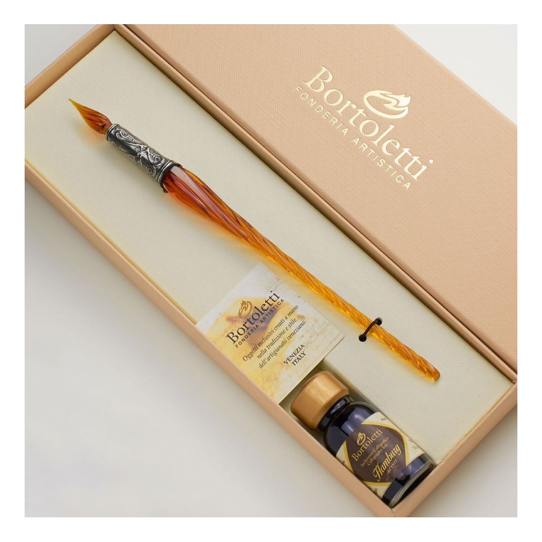 Bortoletti Orseolo Murano Lasi Calligraphy Set on käsityönä oleva venetsialainen kirjoitusjoukko, joka on valmistettu kaksivärinen kierretty Murano-lasi, jossa on lasillinen nib yhden linjan kalligrafiaa varten. Toimitetaan 15 ml: n pullo Hamburg Kalligrafiallinen muste ja esitetty tyylikäs lahjapakkaus, jossa on kulta-leimattu logo, se on hienostunut valinta tyylikkäästä käsinkirjoituksesta, piirustuksesta ja perinnöstä innoittamasta lahjasta.
