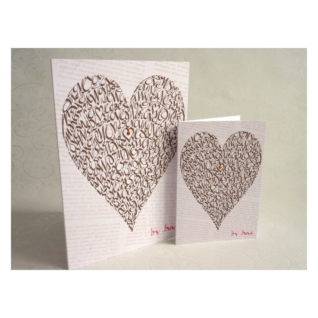 Valentine sydämen muotoinen, tämä kortti on suunniteltu käyttäen kalligrafiaa sanoja ja lauseita, jotka juhlivat rakkautta ja onnea. Diamantit sijoitetaan kummallekin puolelle kortin alareunassa, ja diamante lisäämällä ylimääräistä kipinää sydämessä suunnittelun keskellä. Suklaa-muotoilu antaa kortille rikas, lämmin ulkoasu, joka sopii kauniisti romanttisiin tilaisuuksiin.