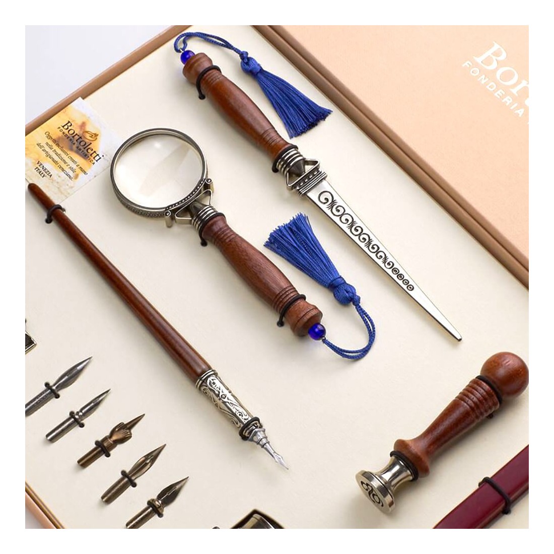 Cet impressionnant Bortoletti ensemble comprend un stylo de calligraphie en bois de hêtre mesurer approximativement 21 cm, six nibiles vintage, 30 ml encre de calligraphie noire, un ouvre-lettres en bois de hêtre, un Loupe en bronze plaqué nickel-argent, un Joint de cire en bois avec plaque interchangeable, cire d'étanchéité, Crème d'or pour mettre en évidence les impressions de cire, une boîte-cadeau de présentation élégante et un certificat de garantie. Il rassemble une expérience d'écriture et d'étanchéité complète dans une collection coordonnée pour le bureau.