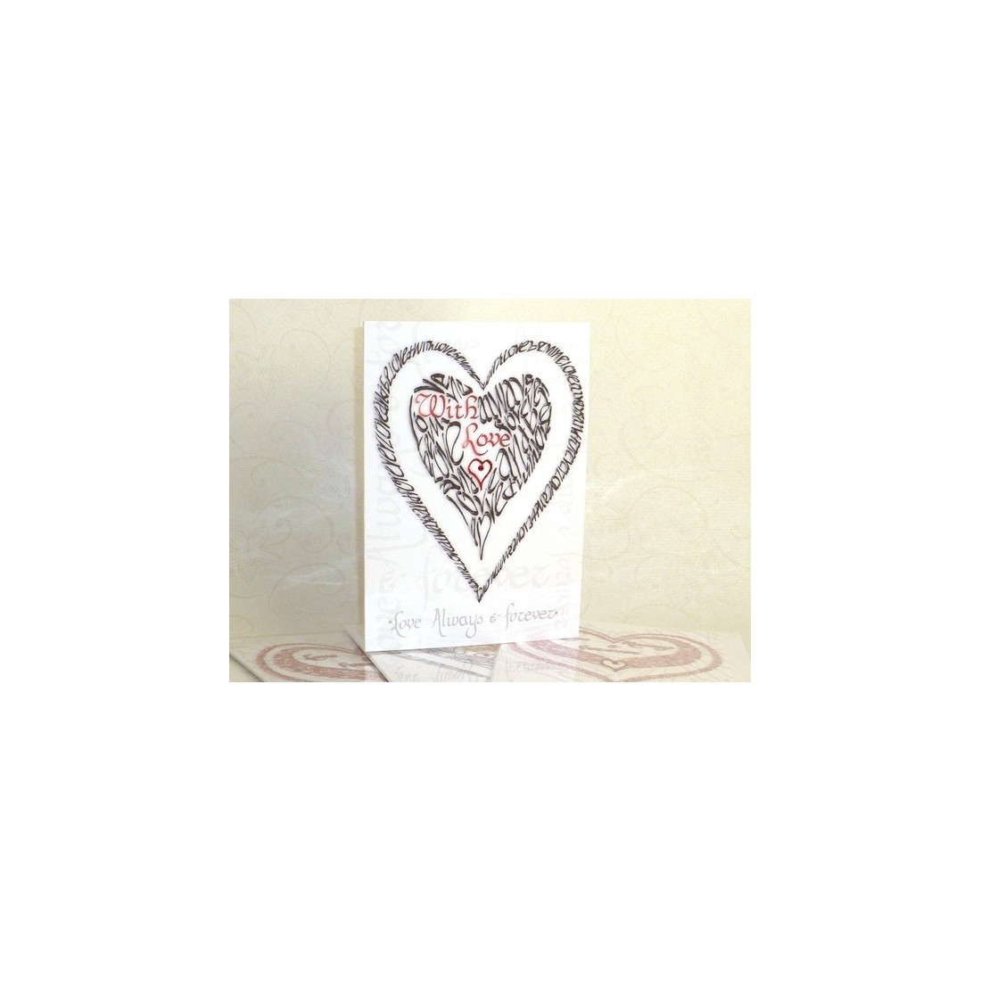 Laissez votre amour que vous vous souciez avec cette carte vraiment merveilleux. La conception principale est présenté sur un fond "Love Always and Forever" texte. Paillettes rouge et un diamant étincelant sont au cœur de la carte avec d'autres strass claires ailleurs.