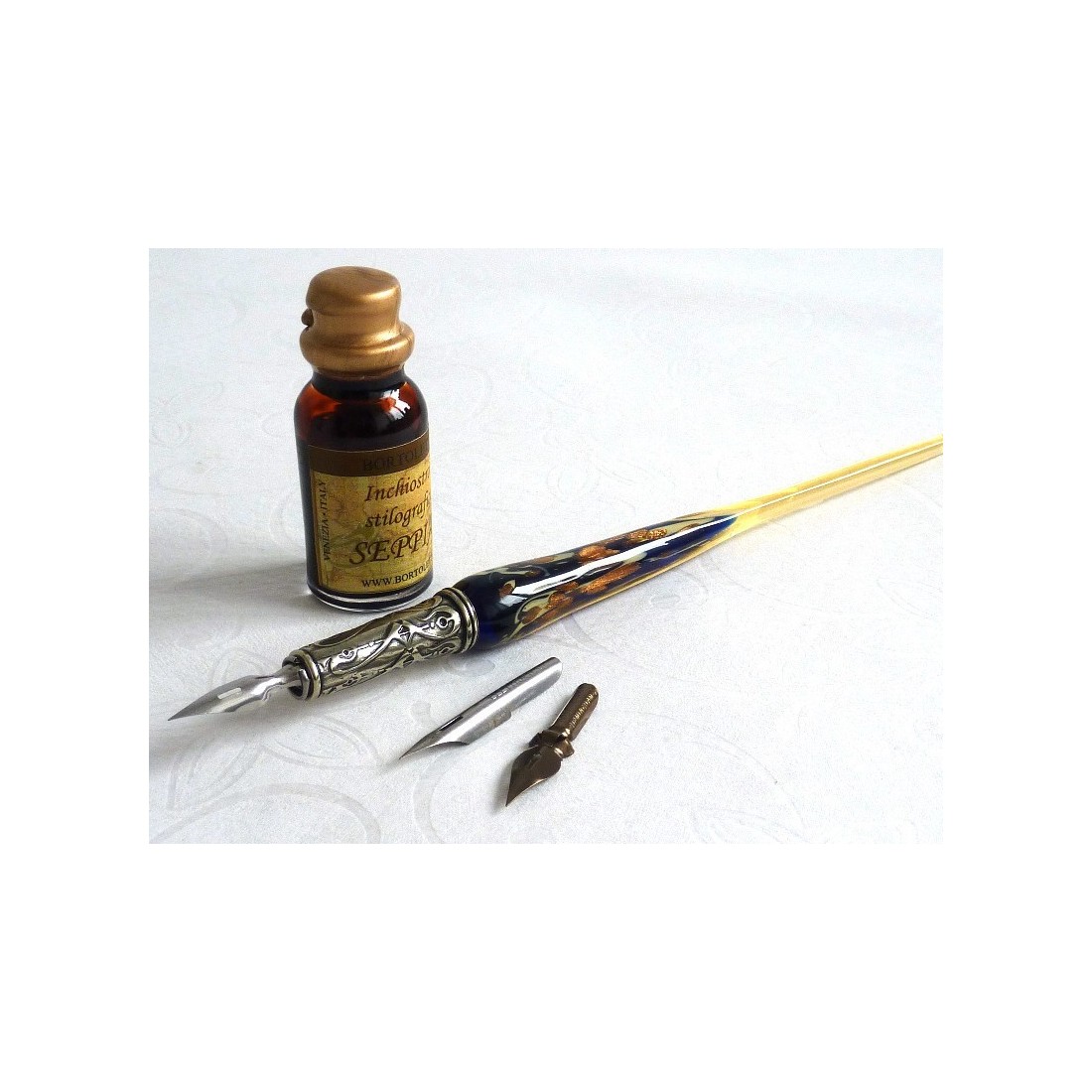 Un magnifiquement conçu, fini à la main, la calligraphie plongeon ensemble stylo, qui comprend un stylo en verre de Murano avec des flocons de feuilles d'or, trois plumes et une bouteille d'encre. Disponible dans une gamme de couleurs merveilleuses.