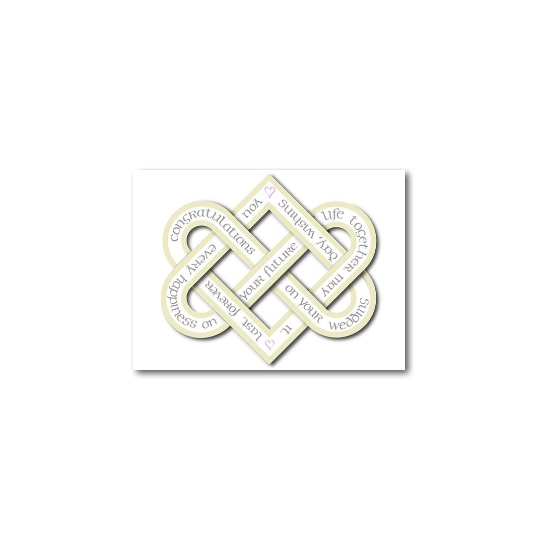 Féliciter le couple heureux le jour de leur mariage avec cette conception unique. Un merveilleux celtique amour éternel noeud en forme avec deux coeurs enlacés magnifiquement et contenant une belle script. Une carte de pearlised formidable qui scintille à merveille.